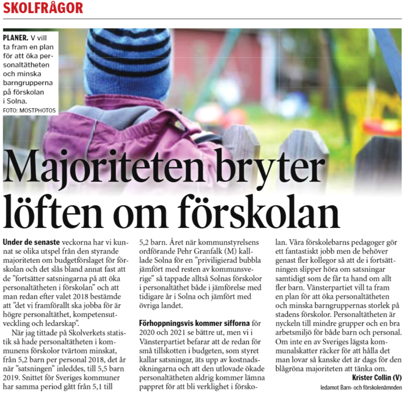 När jag tittade på Skolverkets statistik så hade personaltätheten i kommunens förskolor tvärtom minskat, från 5.2 barn per personal 2018, det år när ”satsningen” inleddes, till 5.5 barn 2019. Snittet för Sveriges kommuner har samma period gått från 5.1 till 5.2 barn. Året när kommunstyrelsens ordförande Pehr Granfalk (M) kallade Solna för en ”priviligierad bubbla jämfört med resten av kommunsverige” så tappade alltså Solnas förskolor i personaltäthet både i jämförelse med tidigare år i Solna och jämfört med övriga landet. Förhoppningsvis kommer sifforna för 2020 och 2021 se bättre ut, men vi i Vänsterpartiet befarar att de redan för små tillskotten i budgeten, som styret kallar satsningar, äts upp av kostnadsökningarna och att den utlovade ökade personaltätheten aldrig kommer lämna pappret för att bli verklighet i förskolan.
