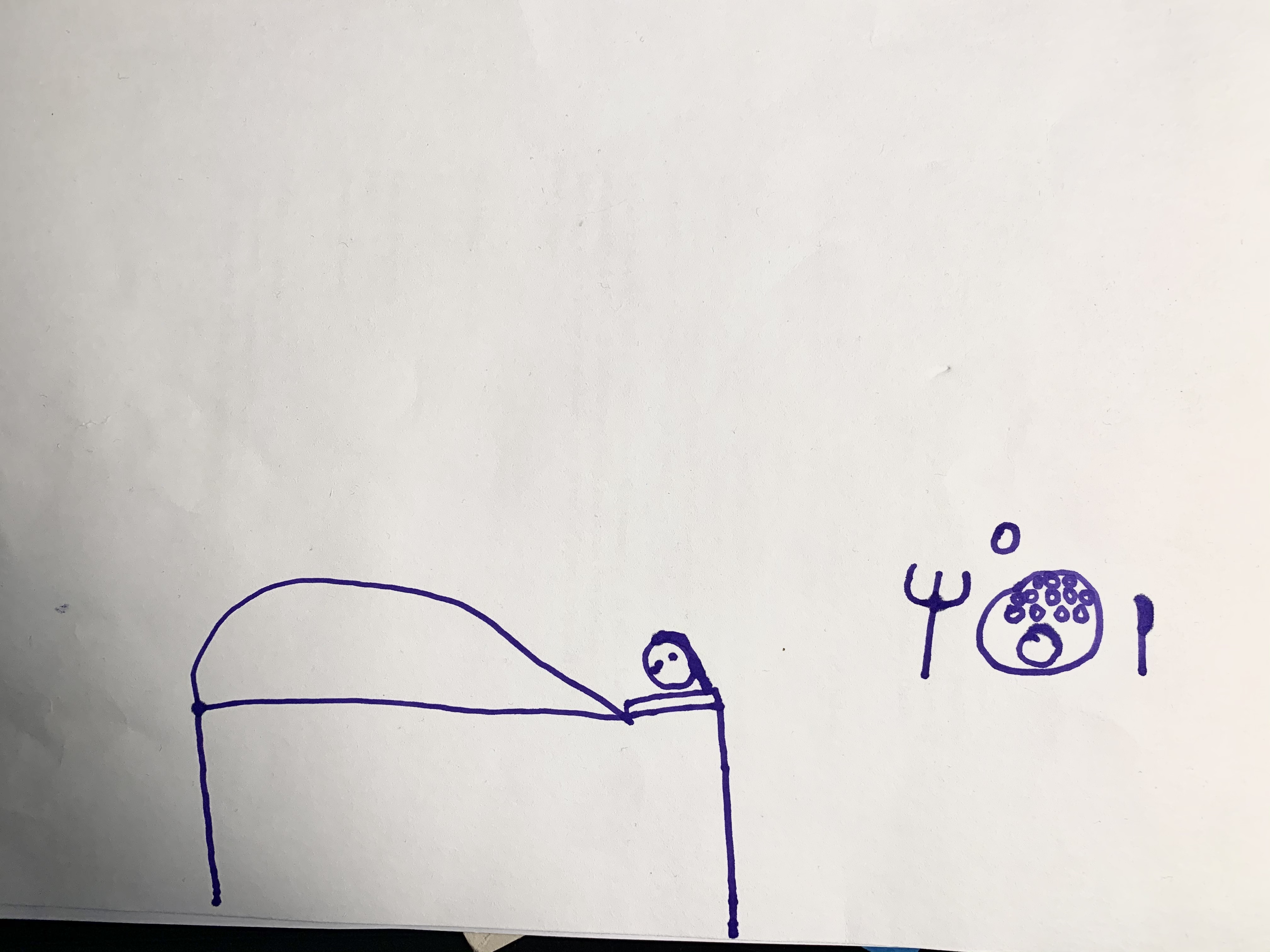 Bilden: Laura 5 år illustrerar punkt 27 och 31 i Barnkonventionen (barn har rätt till vila och mat).