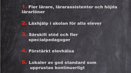 1. Fler lärare i skolan och höjda lärarlöner. Dessutom vill vi ha lärarassistenter som gör en del av det administrativa arbetet, så att lärarna kan fokusera på att vara lärare.